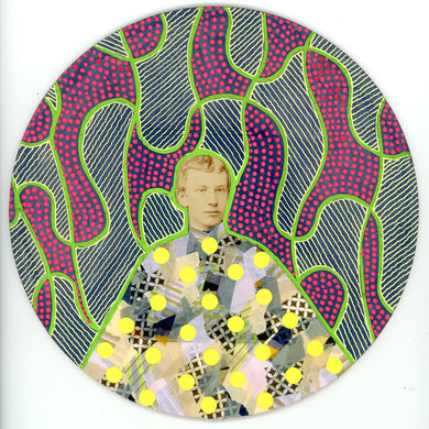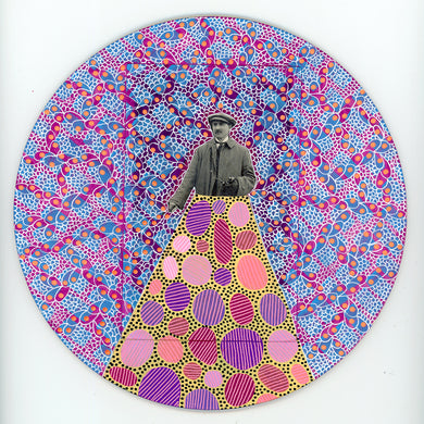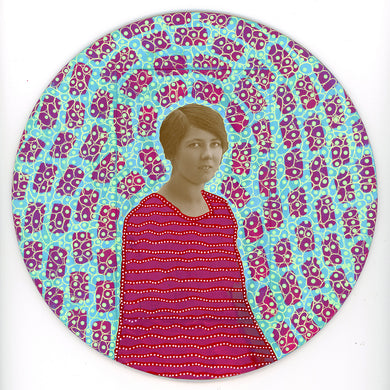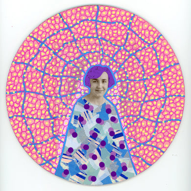 Original collage on wood panel, portrait of vintage woman in pink, orange and blue